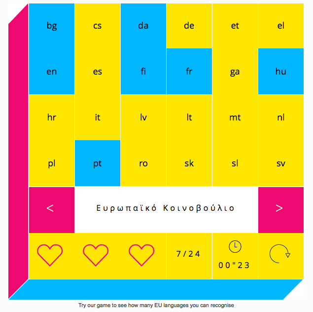 The quiz presents you with the translations of the phrase "European Parliament" into the EU's 24 official languages. Your job is to determine what language it is and then figure out what is the corresponding language code of that language in a race against the clock.